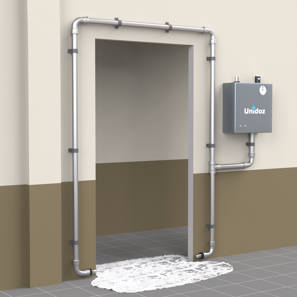 Penasta dezinfekcijska preproga Unidoz je stacionarna dezinfekcijska naprava, namenjena avtomatskemu nanosu dezinfekcijskega sredstva v obliki pene na talno površino na prehodnih točkah za pešce in vozila. Sistem je zasnovan za nadzorovano dezinfekcijo obutve in koles vozil ob vstopu v higiensko nadzorovana območja.