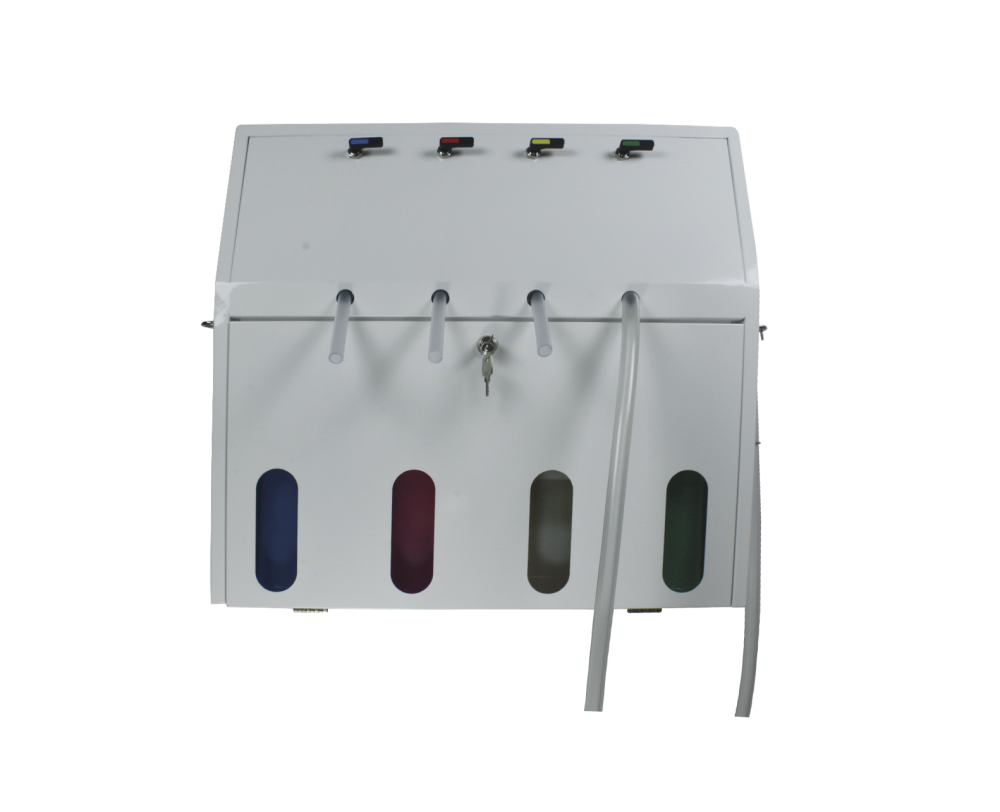 Sistem 4WAY z zaprtim dozirnim krogom je varen, na steno nameščen dozirni sistem z upravljanjem na ključ, zasnovan za štiri 5-litrske posode s kemikalijami.Uporablja standardni vodovodni tlak za zajemanje in mešanje kemičnih izdelkov z vodo ter s tem ustvarja natančno razredčene raztopine.Te raztopine se nato dozirajo skozi štiri prilagodljive iztočne cevi, primerne tako za polnjenje steklenic kot večjih posod in veder.